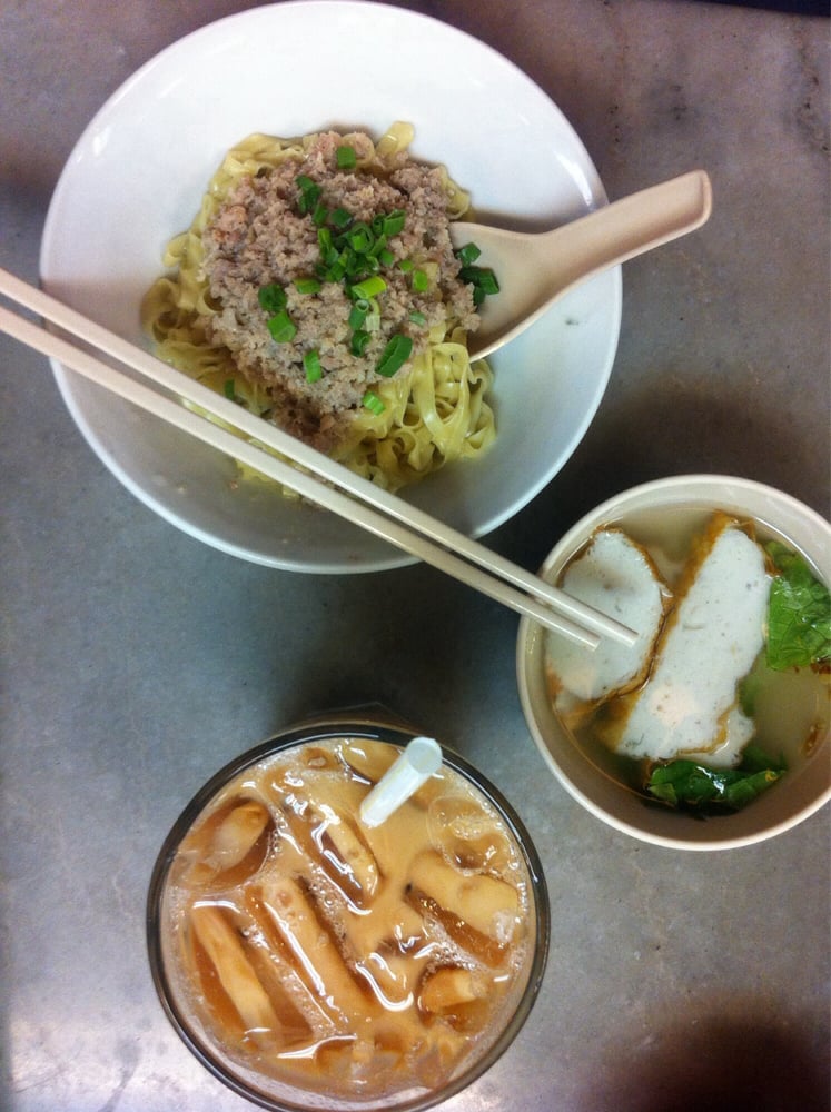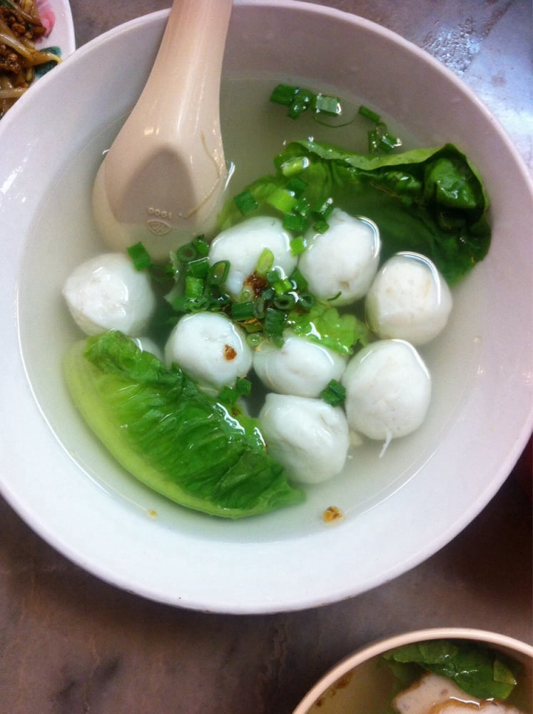 Delicate handmade fish noodles paired with savory dry glass noodles, topped with fresh herbs and spices.
